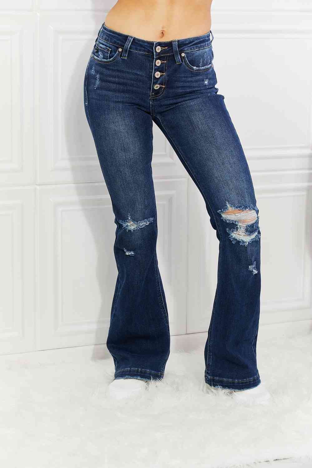 Everything about these jeans is designed to flatter you while keeping you feeling comfy. The midrise waist is decorated with a button fly that adds an elevating touch, while the distressing at the knees keeps them casual. The understated flare silhouette accentuates your feminine figure to keep you looking classy and ever in style. Made with a blend of high-quality and comfort-enhancing fabrics, these jeans will last for many seasons.