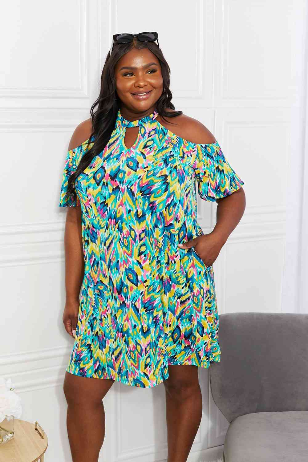 Take a trip to paradise in this vibrant printed dress! The cold-shoulder cutout adds a unique touch, while the halter neck gives it that summery feel. Pair with comfy sandals for a vacation-friendly look, or dress it up with heels.