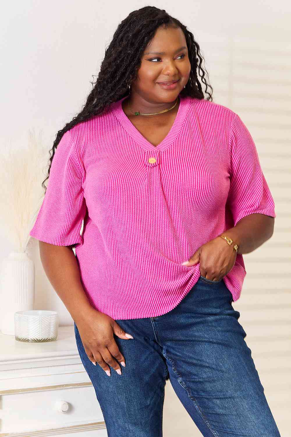 The epitome of chic comfort and style. Crafted with a luxuriously soft ribbed knit fabric, this top offers a flattering and comfortable fit that's perfect for any occasion. The V-neckline adds a touch of sophistication, while the decorative button detail along the front adds a unique and fashionable twist to a classic design.