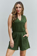 This romper combines chic design elements with practical features, making it a must-have for any fashion-forward individual. This romper offers a soft and breathable feel, ensuring maximum comfort even on the hottest days. The sleeveless design allows for unrestricted movement and helps you stay cool while enjoying outdoor activities or lounging by the pool. One of the standout features of this romper is its elastic waist, which provides a flattering and adjustable fit for all body types. The elastic waistband not only accentuates your natural curves but also offers freedom of movement, making it perfect for any occasion. The ribbed V-neck adds a touch of sophistication to the romper's overall look. It frames your neckline beautifully, adding a subtle hint of allure and elegance. Whether you're going for a casual day out or dressing up for a special event, the ribbed V-neck detailing ensures you look effortlessly stylish.